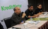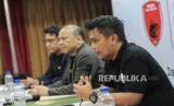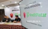 Presiden Direktur Kredit Pintar Ronny Kasim (tengah) bersama Direktur PSM Makassar Rafiuddin Razak (kanan) dan Direktur Bisnis dan Operasi Kredit Pintar Kokko Cattaka (kiri) menyampaikan keterangan terkait kerjasama dengan PSM Makassar di Jakarta, Rabu (18/9/2024). Platform fintech lending Kredit Pintar resmi menjalin kerjasama dengan PT Persaudaraan Sepakbola Makassar sebagai official sponsor dari klub sepakbola liga 1 Indonesia PSM Makassar. Kerjasama dan dukungan tersebut merupakan bagian dari komitmen Kredit Pintar dalam memajukan persepakbolaan tanah air. Jalinan kerjasama tersebut berlangsung selama satu musim kompetisi liga 1 2024/2025. (FOTO : Republika/Thoudy Badai)