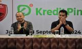 Presiden Direktur Kredit Pintar Ronny Kasim (kiri) bersama Direktur PSM Makassar Rafiuddin Razak (kanan) menyampaikan keterangan terkait kerjasamanya dengan PSM Makassar di Jakarta, Rabu (18/9/2024). Platform fintech lending Kredit Pintar resmi menjalin kerjasama dengan PT Persaudaraan Sepakbola Makassar sebagai official sponsor dari klub sepakbola liga 1 Indonesia PSM Makassar. Kerjasama dan dukungan tersebut merupakan bagian dari komitmen Kredit Pintar dalam memajukan persepakbolaan tanah air. Jalinan kerjasama tersebut berlangsung selama satu musim kompetisi liga 1 2024/2025. (FOTO : Republika/Thoudy Badai)