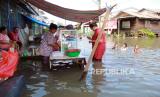 Pedagang melayani pembeli saat banjir rob di Medan Utara, Medan, Sumatera Utara, Kamis (19/9/2024). Badan Meteorologi Klimatologi dan Geofisika (BMKG) Stasiun Meteorologi Kelas II Maritim Belawan memperkirakan banjir rob yang melanda daerah tersebut akan berlangsung hingga 23 September 2024 dengan tinggi air mencapai 2,7 meter. (FOTO : ANTARA FOTO/Yudi Manar)