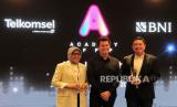 REPUBLIKA.CO.ID, JAKARTA Pendiri Academy Of Pop Simon Fuller bersama Direktur Marketing Telkomsel Derrick Heng dan Direktur Retail Banking BNI Corina Leyla Karnalies menyampaikan keterangan pers pada pengesahan kerja sama jelang peluncuran Academy Of Pop di Jakarta, Jumat (20/9/2024).