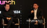 Pendiri Academy Of Pop Simon Fuller (kiri) bersama Direktur Marketing Telkomsel Derrick Heng (kanan) menyampaikan keterangan pers pada pengesahan kerja sama jelang peluncuran Academy Of Pop di Jakarta, Jumat (20/9/2024). Telkomsel dan BNI bekerja sama dengan Simon Fuller, pencipta acara televisi American Idol meluncurkan program pencarian bakat Academy Of Pop (AOP) di Indonesia untuk mempromosikan industri kreatif lokal ke tingkat global. (FOTO : Republika/Thoudy Badai)