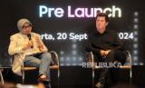 Pendiri Academy Of Pop Simon Fuller (kanan) dan Direktur Retail Banking BNI Corina Leyla Karnalies (kiri) menyampaikan keterangan pers pada pengesahan kerja sama jelang peluncuran Academy Of Pop di Jakarta, Jumat (20/9/2024). Telkomsel dan BNI bekerja sama dengan Simon Fuller, pencipta acara televisi American Idol meluncurkan program pencarian bakat Academy Of Pop (AOP) di Indonesia untuk mempromosikan industri kreatif lokal ke tingkat global. (FOTO : Republika/Thoudy Badai)