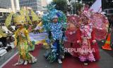 Relawan dari World Clean Up Indonesia mengenakan kostum berbahan sampah saat aksi kampanye lingkungan di Hari Bebas Kendaraan Bermotor (HBKB) atau car free day (CFD), Jakarta, Ahad (22/9/2024). Kampanye tersebut bertujuan untuk mengajak masyarakat agar menjaga lingkungan dari sampah plastik dan sampah ilegal lainnya yang dapat merusak lingkungan. (FOTO : ANTARA FOTO/Akbar Nugroho Gumay)
