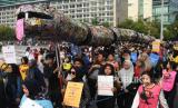 Relawan dari World Clean Up Indonesia membawa ular raksasa berbahan sampah saat menggelar aksi kampanye lingkungan di Hari Bebas Kendaraan Bermotor (HBKB) atau car free day (CFD), Jakarta, Ahad (22/9/2024). Kampanye tersebut bertujuan untuk mengajak masyarakat agar menjaga lingkungan dari sampah plastik dan sampah ilegal lainnya yang dapat merusak lingkungan. (FOTO : ANTARA FOTO/Akbar Nugroho Gumay)