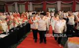 Pelaksana Harian (Plh) Presiden PKS Ahmad Heryawan bersama Sekretaris Jenderal DPP PKS Habib Aboe Bakar Al Habsyi dan Wakil Ketua Dewan Syuro PKS Hidayat Nur Wahid menghadiri penutupan Rakernas PKS di Jakarta, Ahad (22/9/2024). Rapat kerja nasional (rakernas) Partai Keadilan Sejahtera (PKS) tersebut berfokus untuk menggerakan mesin-mesin partai untuk Pilkada, PKS sendiri berpartisipasi di 7 Provinsi dengan 4 Calon Gubernur dan 3 Calon Wakil Gubernur pada Pilkada mendatang. (FOTO : Dok Republika)