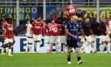 Pemain Inter Milan Federico Dimarco tertunduk saat pemain AC Milan melakukan selebrasi kemenangan pada pertandingan sepak bola Serie A Italia di Stadion Giuseppe Meazza, Milan, Ahad (22/9/2024). AC Milan berhasil mengalahkan Inter Milan pada Derby Della Madonnina dengan skor 2-1. Gol AC Milan dicetak Christian Pulisic di menit ke-10 dan Matteo Gabbia menit ke-89. Satu gol Inter dicetak oleh Federico Dimarco di menit ke-27. (FOTO : EPA-EFE/MATTEO BAZZI)