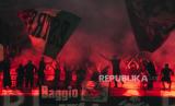 Suporter AC Milan melakukan selebrasi kemenangan pada pertandingan sepak bola Serie A Italia di Stadion Giuseppe Meazza, Milan, Ahad (22/9/2024). AC Milan berhasil mengalahkan Inter Milan pada Derby Della Madonnina dengan skor 2-1. Gol AC Milan dicetak Christian Pulisic di menit ke-10 dan Matteo Gabbia menit ke-89. Satu gol Inter dicetak oleh Federico Dimarco di menit ke-27. (FOTO : AP Photo/Luca Bruno)