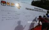 Sejumlah pendukung calon bupati dan wakil bupati Aceh Besar menandatangani baliho Deklarasi Kampanye Damai pilkada tahun 2024 di kota Jantho, kabupaten Aceh Besar, Aceh, Senin (23/9/2024). Deklarasi empat pasangan calon bupati dan wakil bupati kabupaten Aceh Besar itu sebagai kesepakatan dan komitmen bersama untuk melaksanakan kampanye damai pada Pilkada serentak 2024. (FOTO : ANTARA FOTO/Ampelsa)