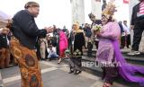 Ketua KPU Jawa Timur Aang Kunaifi (kiri) menyambut kedatangan calon gubernur nomor urut satu Luluk Nur Hamidah (kanan), nomor urut dua Khofifah Indar Parawansa (kedua kanan) dan nomor urut tiga Tri Rismaharini (kedua kiri) saat menghadiri deklarasi kampanye damai Pilkada Jawa Timur 2024 di Surabaya, Jawa Timur, Selasa (24/9/2024). Deklarasi tersebut sebagai upaya dan komitmen bersama untuk menciptakan pelaksanaan jalannya Pilkada Jawa Timur 2024 yang damai. (FOTO : ANTARA FOTO/Moch Asim)