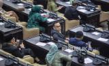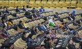 Sejumlah wakil rakyat mengikuti sidang akhir masa jabatan anggota MPR periode 2019-2024 di Ruang Sidang Paripurna, Kompleks Parlemen Senayan, Jakarta, Rabu (25/9/2024). MPR menggelar sidang akhir masa jabatan anggota MPR RI periode 2019-2024 dengan agenda mencakup yaitu laporan Badan Pengkajian MPR, pandangan umum fraksi, hingga penetapan keputusan MPR. Selain itu, disampaikan juga laporan pelaksanaan tugas dan wewenang, serta kinerja pimpinan MPR periode 2019-2024. (FOTO : Republika/Prayogi)