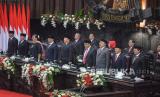 Ketua MPR Bambang Soesatyo bersama pimpinan MPR lainnya menyanyikan Indonesia raya sebelum memimpin sidang akhir masa jabatan anggota MPR periode 2019-2024 di Ruang Sidang Paripurna, Kompleks Parlemen Senayan, Jakarta, Rabu (25/9/2024). MPR menggelar sidang akhir masa jabatan anggota MPR RI periode 2019-2024 dengan agenda mencakup yaitu laporan Badan Pengkajian MPR, pandangan umum fraksi, hingga penetapan keputusan MPR. Selain itu, disampaikan juga laporan pelaksanaan tugas dan wewenang, serta kinerja pimpinan MPR periode 2019-2024. (FOTO : Republika/Prayogi)