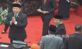 Ketua MPR Bambang Soesatyo bersama pimpinan MPR lainnya memimpin sidang akhir masa jabatan anggota MPR periode 2019-2024 di Ruang Sidang Paripurna, Kompleks Parlemen Senayan, Jakarta, Rabu (25/9/2024). MPR menggelar sidang akhir masa jabatan anggota MPR RI periode 2019-2024 dengan agenda mencakup yaitu laporan Badan Pengkajian MPR, pandangan umum fraksi, hingga penetapan keputusan MPR. Selain itu, disampaikan juga laporan pelaksanaan tugas dan wewenang, serta kinerja pimpinan MPR periode 2019-2024. (FOTO : Republika/Prayogi)