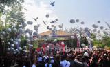Anggota Badan Pengawas Pemilu (Bawaslu) beserta anggota Panitia Pengawas Pemilu Kecamatan (Panwascam) dan Panitia Pengawas Pemilu Kelurahan/Desa (PKD) melepaskan burung merpati sebagai simbol perdamaian saat mengikuti apel siaga tahapan pengawasan Pilkada 2024 di Kudus, Jawa Tengah, Kamis (26/9/2024). Apel siaga itu dalam rangka pemantapan kesiapan dalam mengawasi pelaksanaan Pilkada damai, jujur tanpa politik uang, hoaks dan SARA.  (FOTO : ANTARA FOTO/Yusuf Nugroho)