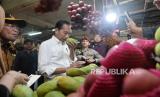 Presiden Joko Widodo melihat kios buah saat mengunjungi Pasar Sanggam Adji Dilayas, Kabupaten Berau, Kalimantan Timur, Kamis (26/9/2024). Presiden Jokowi untuk pertama kalinya berkunjung ke Kabupaten Berau. Kunjungan Jokowi disambut penuh antusias oleh warga. Dalam kunjungannya ke Berau, Jokowi mengecek harga kebutuhan pokok di Pasar Sanggam Adji Dilayas dan melihat fasilitas kesehatan di RSUD Abdul Rivai. (FOTO : Republika/Edwin Dwi Putranto)