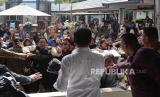 Warga menyambut antusias kehadiran Presiden Joko Widodo saat mengunjungi Pasar Sanggam Adji Dilayas, Kabupaten Berau, Kalimantan Timur, Kamis (26/9/2024). Presiden Jokowi untuk pertama kalinya berkunjung ke Kabupaten Berau. Kunjungan Jokowi disambut penuh antusias oleh warga. Dalam kunjungannya ke Berau, Jokowi mengecek harga kebutuhan pokok di Pasar Sanggam Adji Dilayas dan melihat fasilitas kesehatan di RSUD Abdul Rivai. (FOTO : Republika/Edwin Dwi Putranto)