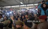 Warga histeris saat menyambut kunjungan Presiden Joko Widodo di Pasar Sanggam Adji Dilayas, Kabupaten Berau, Kalimantan Timur, Kamis (26/9/2024). Presiden Jokowi untuk pertama kalinya berkunjung ke Kabupaten Berau. Kunjungan Jokowi disambut penuh antusias oleh warga. Dalam kunjungannya ke Berau, Jokowi mengecek harga kebutuhan pokok di Pasar Sanggam Adji Dilayas dan melihat fasilitas kesehatan di RSUD Abdul Rivai. (FOTO : Republika/Edwin Dwi Putranto)