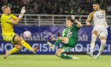 Pesepak bola Persebaya Surabaya Slavko Damjanovic (tengah) menendang bola bola dengan dihadang kiper Dewa United Sonny Stevens (kiri) pada pertandingan BRI Liga 1 di Stadion Gelora Bung Tomo, Surabaya, Jawa Timur, Jumat (27/9/2024). Pertandingan berakhir imbang dengan skor 0-0.  (FOTO : ANTARA FOTO/Rizal Hanafi)