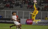 Penjaga Gawang Timnas Timor Leste U-20 Pablo Macario menghalau bola yang di tembakan pemain Timnas Indonesia U-20 pada laga Grup F Kualifikasi Piala Asia U-20 2025 di Stadion Madya, Senayan, Jakarta , Jumat (27/9/2024). Garuda Muda berhasil menang dengan Skor 3-1. (FOTO : Republika/Prayogi)