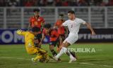 Pemain Timnas Indonesia U-20 Jens Raven berusaha mencetak gol ke gawang Timnas Timor Leste U-20 pada laga Grup F Kualifikasi Piala Asia U-20 2025 di Stadion Madya, Senayan, Jakarta , Jumat (27/9/2024). Garuda Muda berhasil menang dengan Skor 3-1. (FOTO : Republika/Prayogi)