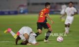 Pemain Timnas Indonesia U-20 M Riski Afrisal terjatuh usai duel dengan pemain Timnas Timor Leste U-20 pada laga Grup F Kualifikasi Piala Asia U-20 2025 di Stadion Madya, Senayan, Jakarta , Jumat (27/9/2024). Garuda Muda berhasil menang dengan Skor 3-1. (FOTO : Republika/Prayogi)