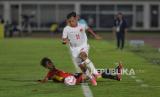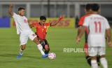 Pemain Timnas Indonesia U-20 M Riski Afrisal berusaha melewati pemain Timnas Timor Leste U-20 pada laga Grup F Kualifikasi Piala Asia U-20 2025 di Stadion Madya, Senayan, Jakarta , Jumat (27/9/2024). Garuda Muda berhasil menang dengan Skor 3-1. (FOTO : Republika/Prayogi)