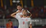 Pemain Timnas Indonesia U-20 Jens Raven bersama rekan setimnya melakukan selebrasi usai mencetak gol ke gawang Timnas Timor Leste U-20 pada laga Grup F Kualifikasi Piala Asia U-20 2025 di Stadion Madya, Senayan, Jakarta , Jumat (27/9/2024). Garuda Muda berhasil menang dengan Skor 3-1. (FOTO : Republika/Prayogi)