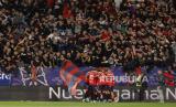 Pemain Osasuna melakukan selebrasi seusai mencetak gol ke gawang Barcelona pada pertandingan La Liga Spanyol di stadion El Sadar di Pamplona, Spanyol, Sabtu (28/9/2024). Barcelona kalah 2-4 saat bertandang ke markas Osasuna. Gol Osasuna dicetak Ante Budimir menit ke-18 dan 72, Bryan Zaragoza menit 28, dan Abel Bretones menit 85. Sementara Barcelona membalas melalui Pau Victor menit ke-53 dan Lamine Yamal menit 89. (FOTO : EPA-EFE/Villar Lopez)