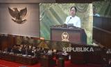 Ketua DPR Puan Maharani menyampaikan pidato saat rapat Paripurna Ke-8 Masa Persidangan I Tahun Sidang 2024-2025 di Kompleks Parlemen, Senayan, Jakarta, Senin (30/9/2024). Rapat paripurna tersebut merupakan rapat paripurna terakhir periode keanggotaan DPR 2019-2024. Ketua DPR RI Puan Maharani langsung memimpin rapat paripurna tersebut. (FOTO : Republika/Prayogi)
