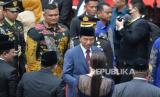 Presiden Joko Widodo bersama pimpinan sidang sementara usai menghadiri sidang awal masa jabatan anggota MPR/DPR/DPD RI Periode 2024-2029 di Ruang Sidang Paripurna, Kompleks Parlemen, Senayan, Selasa (1/10/2024). Sidang awal masa jabatan anggota MPR/DPR/DPD RI Periode 2024-2029 tersebut beragenda pembacaan sumpah atau janji anggota MPR/DPR/DPD RI Periode 2024-2029. Sebanyak 580 anggota DPR dan 152 anggota DPD resmi dilantik dan diambil sumpah jabatannya untuk masa bakti 2024-2029. (FOTO : Republika/Prayogi)
