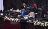 Ketua DPR periode 2019-2024 Puan Maharani memberikan berkas memori DPR kepada pimpinan sidang sementara saat sidang awal masa jabatan anggota MPR/DPR/DPD RI Periode 2024-2029 di Ruang Sidang Paripurna, Kompleks Parlemen, Senayan, Selasa (1/10/2024). Sidang awal masa jabatan anggota MPR/DPR/DPD RI Periode 2024-2029 tersebut beragenda pembacaan sumpah atau janji anggota MPR/DPR/DPD RI Periode 2024-2029. Sebanyak 580 anggota DPR dan 152 anggota DPD resmi dilantik dan diambil sumpah jabatannya untuk masa bakti 2024-2029. (FOTO : Republika/Prayogi)