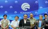 Menteri Komunikasi dan Informatika (Menkominfo) Budi Arie Setiadi (ketiga kiri) bersama Dubes Jepang untuk Indonesia Masaki Yasushi (kedua kanan), Kepala Pusat Gempa Bumi dan Tsunami BMKG Daryono (kedua kiri) dan Dirjen PPI Wayan Toni Supriyanto (ketiga kiri) menunjukkan Disaster Prevention Information System (DPIS) saat konferensi pers peluncuran Sistem Nasional Peringatan Dini Kebencanaan (SNPDK) di Kantor Kementerian Kominfo, Jakarta, Selasa (1/10/2024). Kementerian Kominfo telah membangun Sistem Nasional Peringatan Dini Kebencanaan (SNPDK) yang terdiri atas sistem penyampaian informasi kebencanaan berupa Early Warning System (EWS) dan DPIS sebagai upaya mengurangi risiko bencana di Indonesia. (FOTO : Republika/Thoudy Badai)
