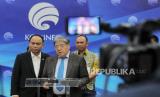Menteri Komunikasi dan Informatika (Menkominfo) Budi Arie Setiadi (tengah) bersama Dubes Jepang untuk Indonesia Masaki Yasushi (kanan) dan Kepala Pusat Gempa Bumi dan Tsunami BMKG Daryono (kiri) menunjukkan Disaster Prevention Information System (DPIS) saat konferensi pers peluncuran Sistem Nasional Peringatan Dini Kebencanaan (SNPDK) di Kantor Kementerian Kominfo, Jakarta, Selasa (1/10/2024). Kementerian Kominfo telah membangun Sistem Nasional Peringatan Dini Kebencanaan (SNPDK) yang terdiri atas sistem penyampaian informasi kebencanaan berupa Early Warning System (EWS) dan Disaster Prevention Information System (DPIS) sebagai upaya mengurangi risiko bencana di Indonesia. (FOTO : Republika/Thoudy Badai)