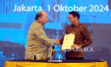 Direktur Corporate Banking Bank Mandiri Riduan bersama Direktur Utama PT Kereta Api Indonesia (KAI) Didiek Hartantyo (dari kiri) usai penandatanganan MoU kerjasama layanan perbankan di Jakarta, Selasa (1/10/2024). Bank Mandiri menyiapkan layanan dan produk perbankan, termasuk penggunaan teknologi Near Field Communication (NFC) untuk sistem pembayaran tiket KRL dan LRT dengan aplikasi Livin by Mandiri. Selain itu, Bank Mandiri juga akan mengembangkan solusi pembayaran berbasis QRIS di loket-loket stasiun dan vending machine di seluruh jaringan KAI. (FOTO : Dok Republika)