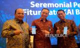 Direktur Corporate Banking Bank Mandiri Riduan, Direktur Information Technology Bank Mandiri Timothy Utama, Direktur Utama PT Kereta Api Indonesia (KAI) Didiek Hartantyo (dari kiri) usai penandatanganan MoU kerjasama layanan perbankan di Jakarta, Selasa (1/10/2024). Bank Mandiri menyiapkan layanan dan produk perbankan, termasuk penggunaan teknologi Near Field Communication (NFC) untuk sistem pembayaran tiket KRL dan LRT dengan aplikasi Livin by Mandiri. Selain itu, Bank Mandiri juga akan mengembangkan solusi pembayaran berbasis QRIS di loket-loket stasiun dan vending machine di seluruh jaringan KAI. (FOTO : Dok Republika)