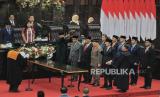 REPUBLIKA.CO.ID, JAKARTA - Ketua dan wakil ketua Majelis Permusyawaratan Rakyat (MPR) RI terpilih periode 2024-2029 mengambil sumpah jabatan saat pelantikan pimpinan MPR RI periode 2024-2029 di gedung Nusantara, Kompleks Parlemen, Senayan, Jakarta, Kamis (3/10/2024).