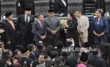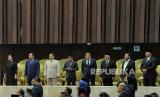 Ketua DPR RI Puan Maharani (kiri) bersama Ketua DPD RI Sultan Najamudin (kedua kiri), Wakil Ketua DPR Adies Kadir (ketiga kiri), Sufmi Dasco (keempat kiri), Saan Mustopa (keempat kanan), Cucun Ahmad (kanan), Wakil Ketua DPD RI Tamsil Linrung (ketiga kanan), Wakil Ketua DPD RI Yorrys Raweyai (kedua kanan), Ketua Partai saat menghadiri acara saat pelantikan pimpinan MPR RI di Gedung Nusantara, kompleks Parlemen, Senayan, Jakarta, Kamis (3/10/2024). Sidang Paripurna MPR RI menyetujui Ahmad Muzani dari Fraksi Partai Gerindra menjadi Ketua MPR RI Periode 2024-2029 menggantikan Bambang Soesatyo selaku Ketua MPR RI periode 2019-2024. (FOTO : Republika/Thoudy Badai)