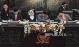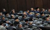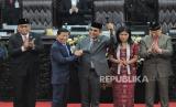 Anggota Majelis Permusyawaratan Rakyat (MPR) RI mengikuti pelantikan pimpinan MPR RI periode 2024-2029 di gedung Nusantara, Kompleks Parlemen, Senayan, Jakarta, Kamis (3/10/2024). Sidang Paripurna MPR RI menyetujui Ahmad Muzani dari Fraksi Partai Gerindra sebagai ketua MPR RI periode 2024-2029 menggantikan Bambang Soesatyo selaku Ketua MPR RI periode 2019-2024. (FOTO : Republika/Thoudy Badai)