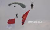 Prajurit TNI melakukan terjun payung saat perayaan Hari Ulang Tahun (HUT) ke-79 Tentara Nasional Indonesia (TNI) di Kawasan Monas, Jakarta, Sabtu (5/10/2024). Perayaan HUT Ke-79 TNI tersebut diisi oleh berbagai  atraksi unjuk kemampuan dan kekuatan bertempur prajurit TNI dari matra darat, laut dan udara. Aksi itu mulai dari berbagai demonstrasi mulai dari terjun payung sampai bela diri militer hingga atraksi pesawat. (FOTO : Republika/Prayogi)