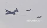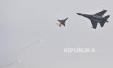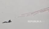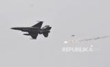 Pesawat tempur TNI beraksi saat perayaan Hari Ulang Tahun (HUT) ke-79 Tentara Nasional Indonesia (TNI) di Kawasan Monas, Jakarta, Sabtu (5/10/2024). Parade alutsista  HUT ke-79 TNI ini dimeriahkan oleh 1.059 alutsista yang terdiri dari berbagai alutsista yang berasal dari tiga matra yakni, TNI Angkatan Darat (AD), Angkatan Laut (AL), dan Angkatan Udara (AU). Dalam kesempatan tersebut masyarakat juga turut menaiki kendaraan truk lapis baja  hingga kendaraan tempur tank baja dengan didampingi oleh para prajurit TNI. (FOTO : Republika/Prayogi)
