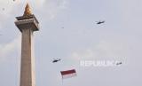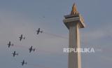 Pesawat TNI menghibur tamu undangansebelum upacara Hari Ulang Tahun (HUT) ke-79 Tentara Nasional Indonesia (TNI) di Kawasan Monas, Jakarta, Sabtu (5/10/2024). HUT ke-79 TNI tersebut mengangkat tema TNI Modern Bersama Rakyat Siap Mengawal Suksesi Kepemimpinan Nasional Untuk Indonesia Maju. (FOTO : Republika/Prayogi)