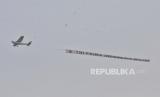 Pesawat TNI membawa spanduk ucapan sebelum upacara Hari Ulang Tahun (HUT) ke-79 Tentara Nasional Indonesia (TNI) di Kawasan Monas, Jakarta, Sabtu (5/10/2024). HUT ke-79 TNI tersebut mengangkat tema TNI Modern Bersama Rakyat Siap Mengawal Suksesi Kepemimpinan Nasional Untuk Indonesia Maju. (FOTO : Republika/Prayogi)