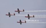 Pesawat aerobatik Jupiter TNI menunjukkan aksinya saat perayaan Hari Ulang Tahun (HUT) ke-79 Tentara Nasional Indonesia (TNI) di Kawasan Monas, Jakarta, Sabtu (5/10/2024). Perayaan HUT Ke-79 TNI tersebut diisi oleh berbagai  atraksi unjuk kemampuan dan kekuatan bertempur prajurit TNI dari matra darat, laut dan udara. Aksi itu mulai dari berbagai demonstrasi mulai dari terjun payung sampai bela diri militer hingga atraksi pesawat. (FOTO : Republika/Prayogi)
