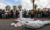 Warga melakukan sholat jenazah korban serangan udara militer Israel di Rumah Sakit Martir Al Aqsa di kota Deir Al Balah, Jalur Gaza tengah, Selasa (8/10/2024). Israel kembali melancarkan serangan udara ke kamp pengungsi Al Bureij. Lebih dari 41.900 warga Palestina meninggal akibat serangan militer Israel sejak 7 Oktober 2023. (FOTO : EPA-EFE/MOHAMMED SABER)