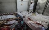 Seorang pria melihat jenazah korban serangan udara militer Israel di Rumah Sakit Martir Al Aqsa di kota Deir Al Balah, Jalur Gaza tengah, Selasa (8/10/2024). Israel kembali melancarkan serangan udara ke kamp pengungsi Al Bureij. Lebih dari 41.900 warga Palestina meninggal akibat serangan militer Israel sejak 7 Oktober 2023. (FOTO : EPA-EFE/MOHAMMED SABER)