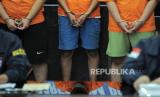 REPUBLIKA.CO.ID, JAKARTA Tersangka dihadirkan saat konferensi pers terkait pengungkapan kasus judi online di Bareskrim Polri, Jakarta, Selasa (8/10/2024).