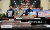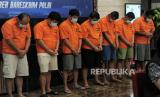 Tersangka dihadirkan saat konferensi pers terkait pengungkapan kasus judi online di Bareskrim Polri, Jakarta, Selasa (8/10/2024). Dirtipidsiber Polri berhasil mengungkap kasus judi online dari situs Slot8278 yang dikendalikan oleh WNA asal China dan beroperasi di Indonesia dengan perputaran uang senilai Rp685,5 miliar. Dalam pengungkapan kasus tersebut, Bareskrim Polri menetapkan 7 tersangka dan berhasil menyita sejumlah barang bukti berupa uang tunai sebesar Rp6 miliar, 17 unit ponsel, 3 unit laptop, 1 unit ipad dan 4 unit token bank. (FOTO : Republika/Thoudy Badai)
