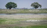 Debit air waduk seluas 5,7 hektar yang dimanfaatkan petani untuk mengairi sawah tadah hujan tersebut menyusut akibat musim kemarau dan sawah terancam puso.
