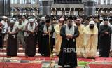 Imam Besar Masjid Nabawi Syekh Ahmad bin Ali Al Hudhaify (keempat kiri) melaksanakan salat jenazah di Masjid Istiqlal, Jakarta, Jumat (11/10/2024). Dalam kunjungannya ke Indonesia, Imam Masjid Nabawi Syekh Ahmad bin Ali Al Hudhaify mengisi agenda khutbah jumat serta memimpin salat dihadapan ribuan jamaah di Masjid Istiqlal. Kunjungan ke Indonesia tersebut dalam rangka inisiatif Arab Saudi untuk mempererat hubungan diplomatik dan keagamaan dengan negara-negara islam, terutama Indonesia. Sebelumnya, dalam rangkaian kunjungannya, Syekh Ahmad bin Ali Al Hudhaify bertemu sejumlah pejabat tinggi negara, ormas islam serta lembaga pendidikan islam. (FOTO : Republika/Thoudy Badai)