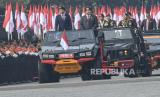 Presiden Joko Widodo (kiri) didampingi Menteri Pertahanan sekaligus Presiden Terpilih 2024–2029 Prabowo Subianto (kanan) berada di atas kendaraan maung untuk mengikuti upacara penganugerahan medali kehormatan keamanan dan keselamatan publik Loka Praja Samrakshana di Mako Brimob, Kelapa Dua, Depok, Jawa Barat, Senin (14/10/2024). Presiden Joko Widodo menerima medali kehormatan keamanan dan keselamatan publik Loka Praja Samrakshana sebagai bentuk apresiasi Polri atas perannya dalam pengembangan organisasi Korps Bhayangkara. (FOTO : ANTARA FOTO/Muhammad Adimaja)