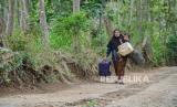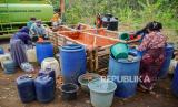 Warga membawa jeriken saat penyaluran bantuan air bersih di Desa Jenggrong, Kecamatan Ranuyoso, Lumajang, Jawa Timur, Selasa (15/10/2024). Pemerintah Kabupaten Lumajang melalui Badan Penanggulangan Bencana Daerah (BPBD) menyalurkan bantuan air bersih sebanyak sembilan armada tangki berkapasitas 5.000 liter ke 213 titik di 18 Desa terdampak kekeringan sejak tiga bulan terakhir. (FOTO : ANTARA FOTO/Irfan Sumanjaya)